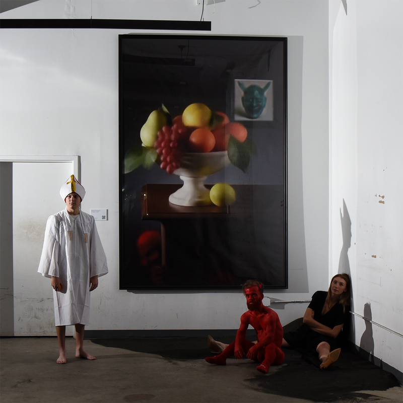 Semi-Gloss Acrylic Paint on Wood, Steel Roman Pole, 12-Color Inkjet Print on Canvas